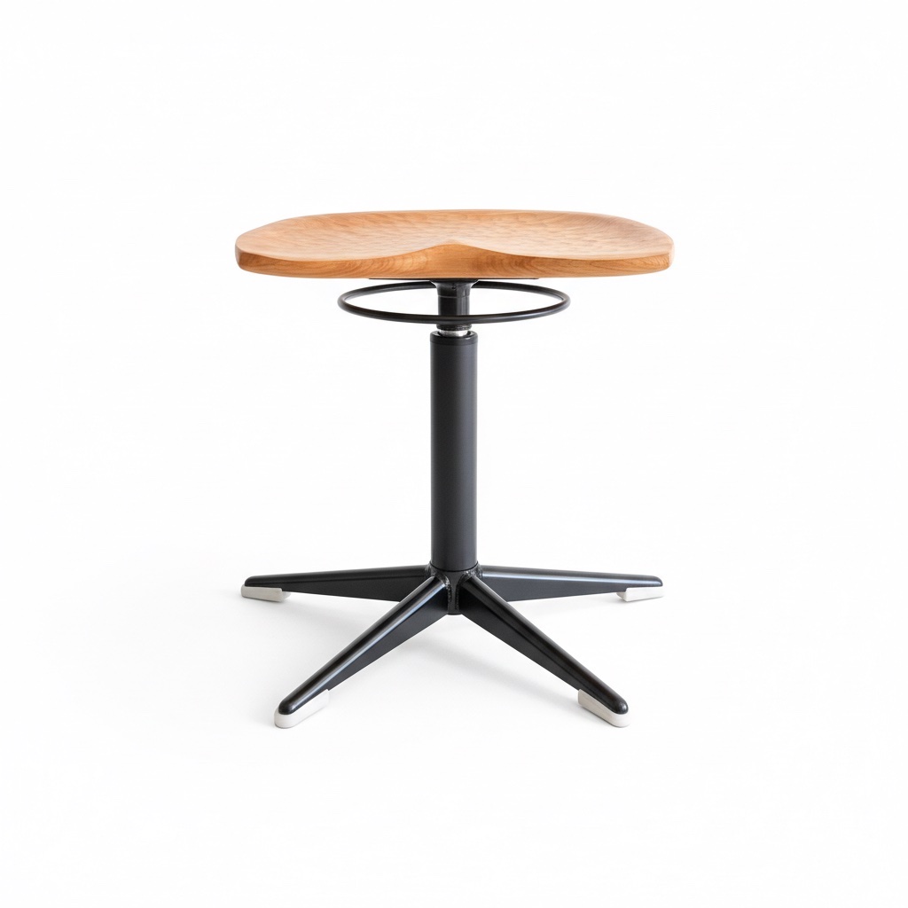Height-adjustable stool featuring a hand-carved seat made from regional cherry wood. The original metal base has been sustainably upcycled, combining industrial structure with sculptural woodwork.